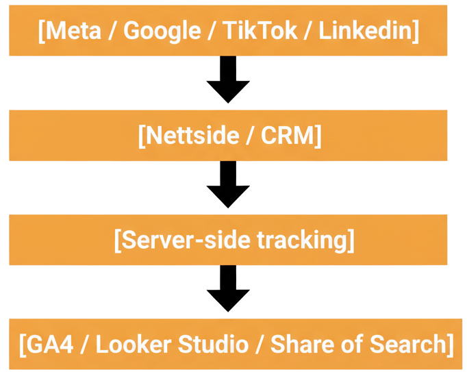 Analyse og rapportering – kobling mot GA4, Looker Studio, CRM og Share of Search dashboards.